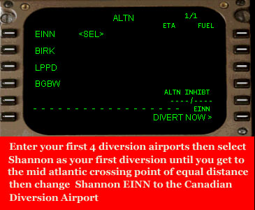 For a flight across the North Atlantic Glasgow Belfast or Shannon would be the first possible two airports aircraft could turn back to going Westbound and then Reykjavik in Iceland could also be used plus Nararsuaq in Greenland and St Johns Halifax or Gander on the west side. Other considerations would be can that airport handle this aircraft has the airport got the fuel we need has it got the necessary emergency facilities ? The pilot would then plot the airport equal distance points on the map. On the Level D 767 you could put in all the diversion airports in the Alternate airports page. You can also include Santa Maria in the Azores in the list. You then only have to look to see which airport is the closest. On Southerly tracks Lisbon or Oporto could also be used. Below shows the Level d 767 FMC Alternate Division Airports page with suggested diversion airports put in